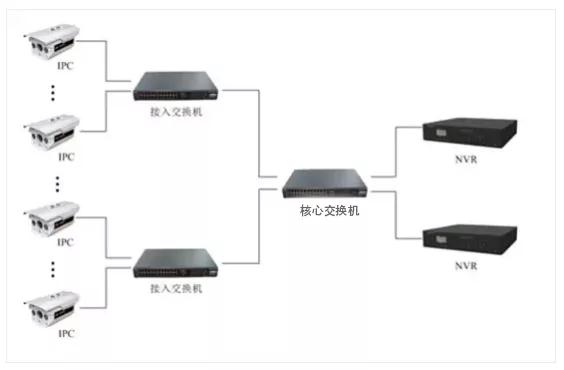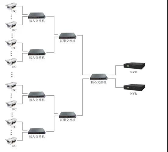 如采用200萬像素IPC,碼流以4Mbps計算,100臺攝像機(jī)占用帶寬為4M*100=400M,如果是按照10臺攝像機(jī)接入百兆交換機(jī)的話,那么我們需要10臺接入層交換機(jī),那么核心層交換機(jī)需要三層全千兆交換機(jī)。